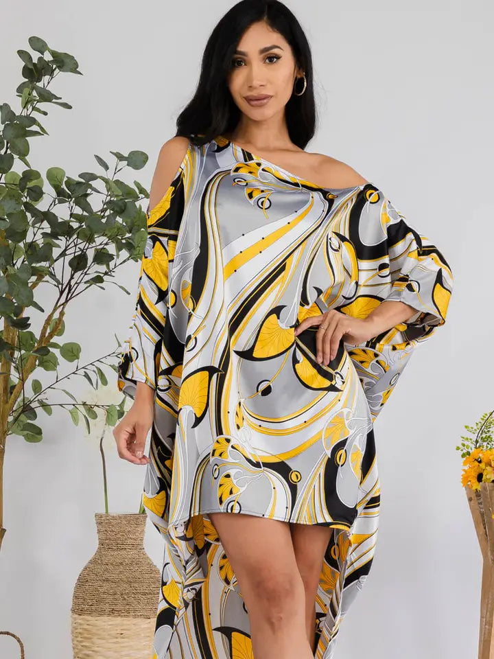 5.22.25 Dress HH Geo metric gray/gold satin off shoulder OS
