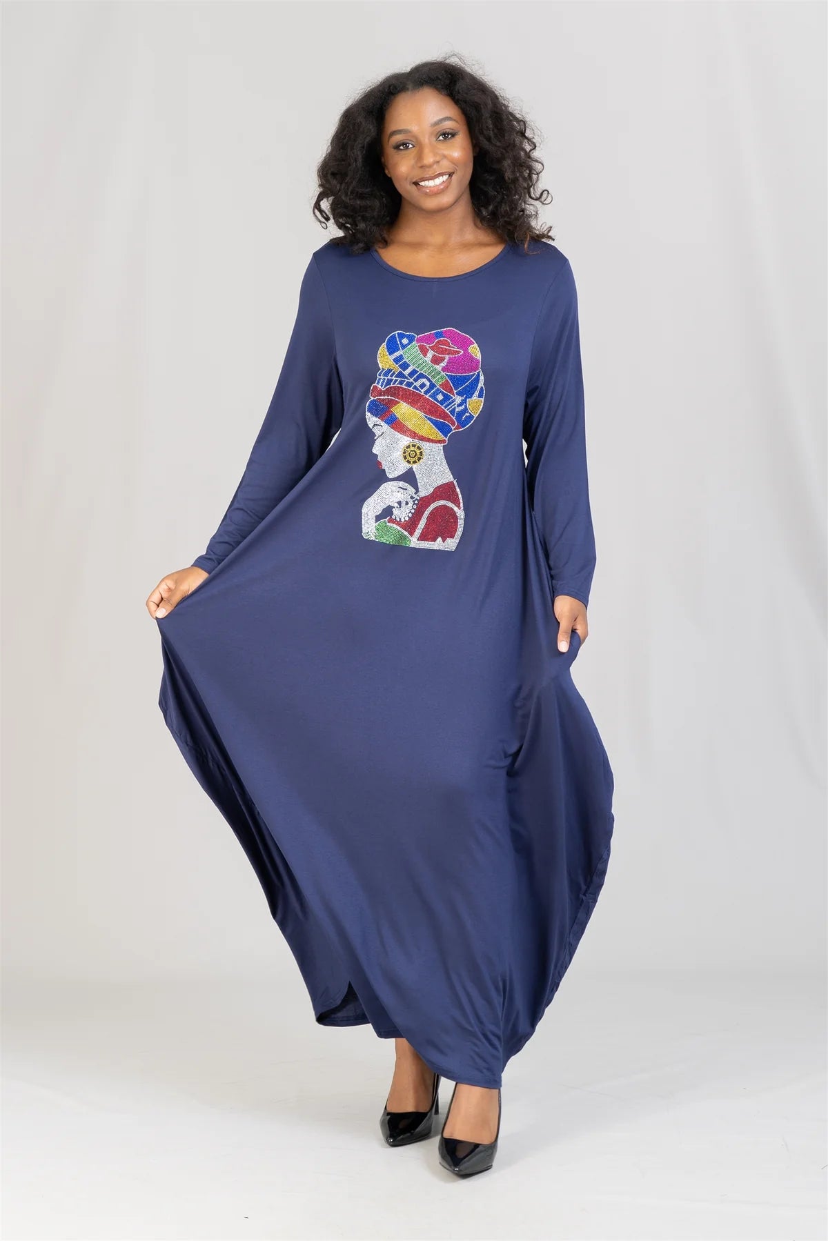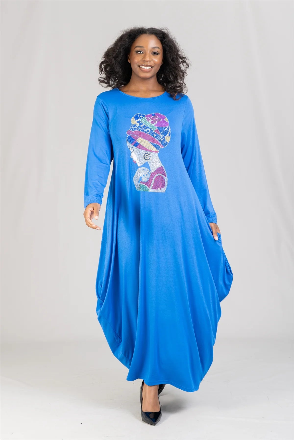 This elegant dress features a comfortable jersey knit fabric expertly embellished with sparkling rhinestones that highlight a striking African lady head design. Crafted to offer both style and comfort, it is available in sizes up to 2X, making it a versatile addition to your wardrobe. The bubble silhouette adds a contemporary touch while ensuring a flattering fit. Perfect for those seeking a unique piece that celebrates cultural artistry with a modern twist.