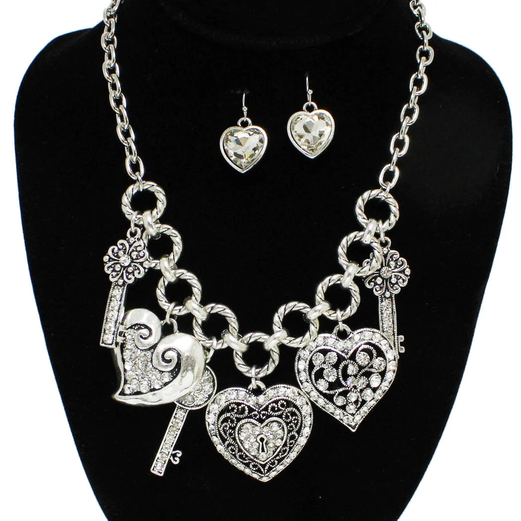 8.8.25 Necklace HEART & KEY RHINESTONE CHARM NECKLACE w earrings
