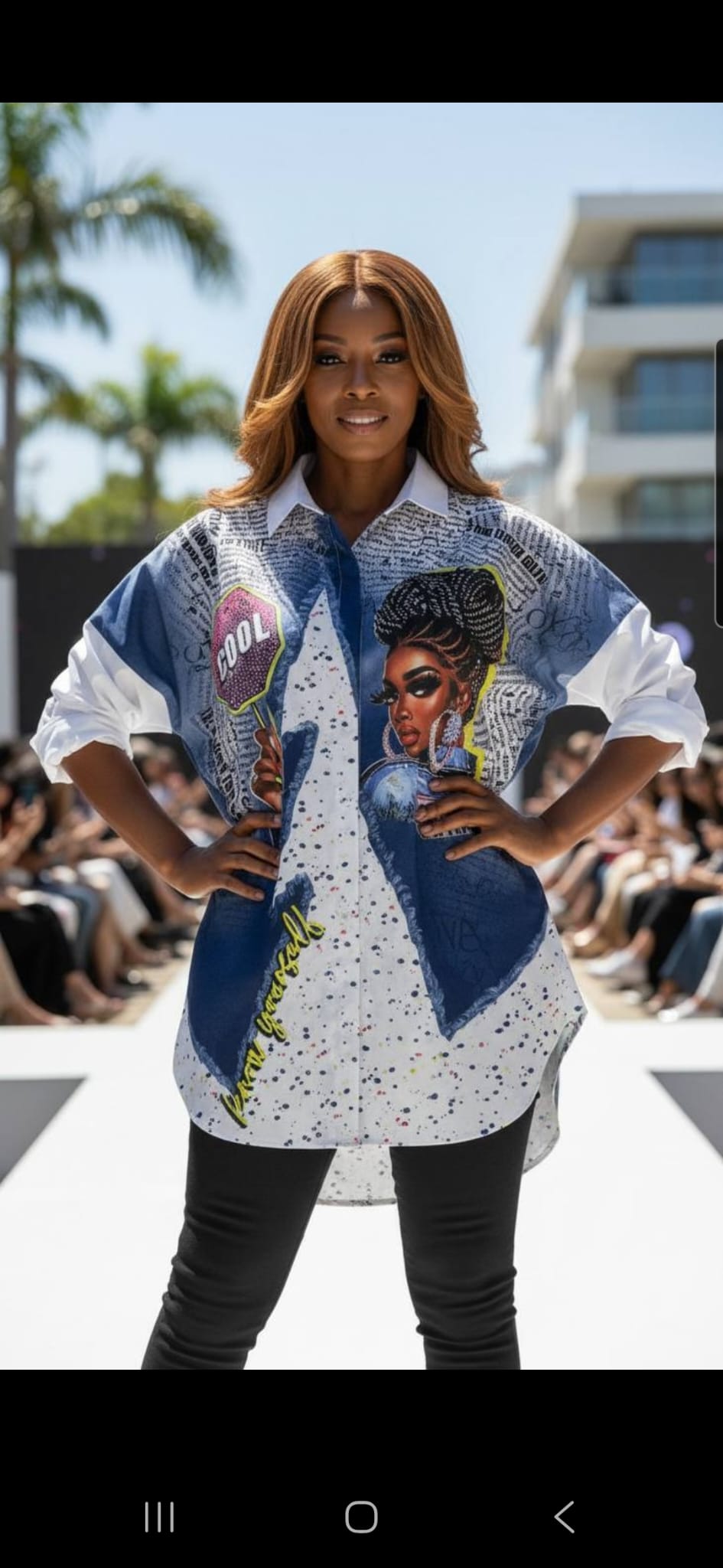 This stylish blouse features intricate cornrows on a beautiful black woman, accented with button up detailing and stone embellishments. Elevate your wardrobe with this unique and eye-catching piece. Made for confident and fashion-forward individuals.