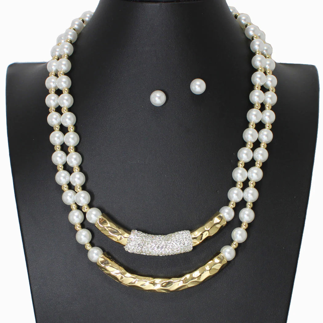 This elegant necklace features a hammered metal design accented with shimmering crystal rhinestones and a delicate pearl, creating a sophisticated blend of texture and sparkle. Measuring 19 inches with a 2-inch extender, it offers versatile wear. Matching earrings, sized at 0.3 inches with secure posts, complete the refined set, perfect for adding a touch of expert craftsmanship to any ensemble.