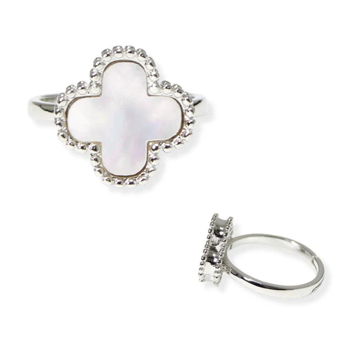 This elegant, adjustable designer-inspired ring features a delicate mother of pearl clover set in gold-plated metal. Measuring 0.5 inches in height, its adjustable band ensures a comfortable and perfect fit. The harmonious blend of gold and white tones adds a subtle yet sophisticated touch to any ensemble. Ideal for those seeking refined style with versatile wearability.